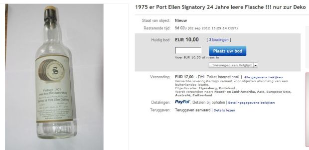 Vandaag kondigde Diageo de special releases voor dit jaar aan. Welke het zijn heb je ongetwijfeld al elders gelezen (knap dat de servers van Facebook dit aankunnen). Zeer leuk allemaal, er zitten enkele bijzondere bottelingen tussen, ware het niet van de prijzen. Dat Brora duurder wordt, dat viel te vrezen, het is ook een 35-jarige deze keer. Maar de Port Ellen, die welgeteld één jaar ouder is dan de release van vorig jaar, 600 pond??? Dat is aan de huidge koers meer dan 750 euro. Of voor de mensen die nog in Belgische Frank rekenen: 30.000 frank. De Port Ellen 11 kon je vorig jaar kopen aan 335 euro. Dat is dus meer dan het dubbele op één jaar tijd. Oké, het pond is op dat jaar ook nog iets gestegen, maar dan nog. Meer dan het dubbele… De prijzen van de andere bottelingen zijn trouwens bijna even aberrant. En dan krijg je dit natuurlijk (let op, nog meer dan vijf dagen bieding te gaan):