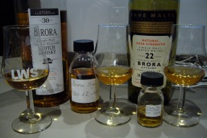 Dominiek’s Brora 27y 1981/2008, 53.8%, Duncan Taylor, cask 1427 vs. mijn Brora 18y 1981/1999, 50% DL OMC, 335 bottles. Deze laatste won overtuigend het pleit. De DT kan je omschrijven als een Clynelish (mineralig, was, bloemen) met een toefje turf, in de tweede herken je onmiskenbare Brora. Voor mij is deze de tot op heden de beste jaren tachtig Brora. Wat niet wil zeggen dat de DT niet lekker was, integendeel.
